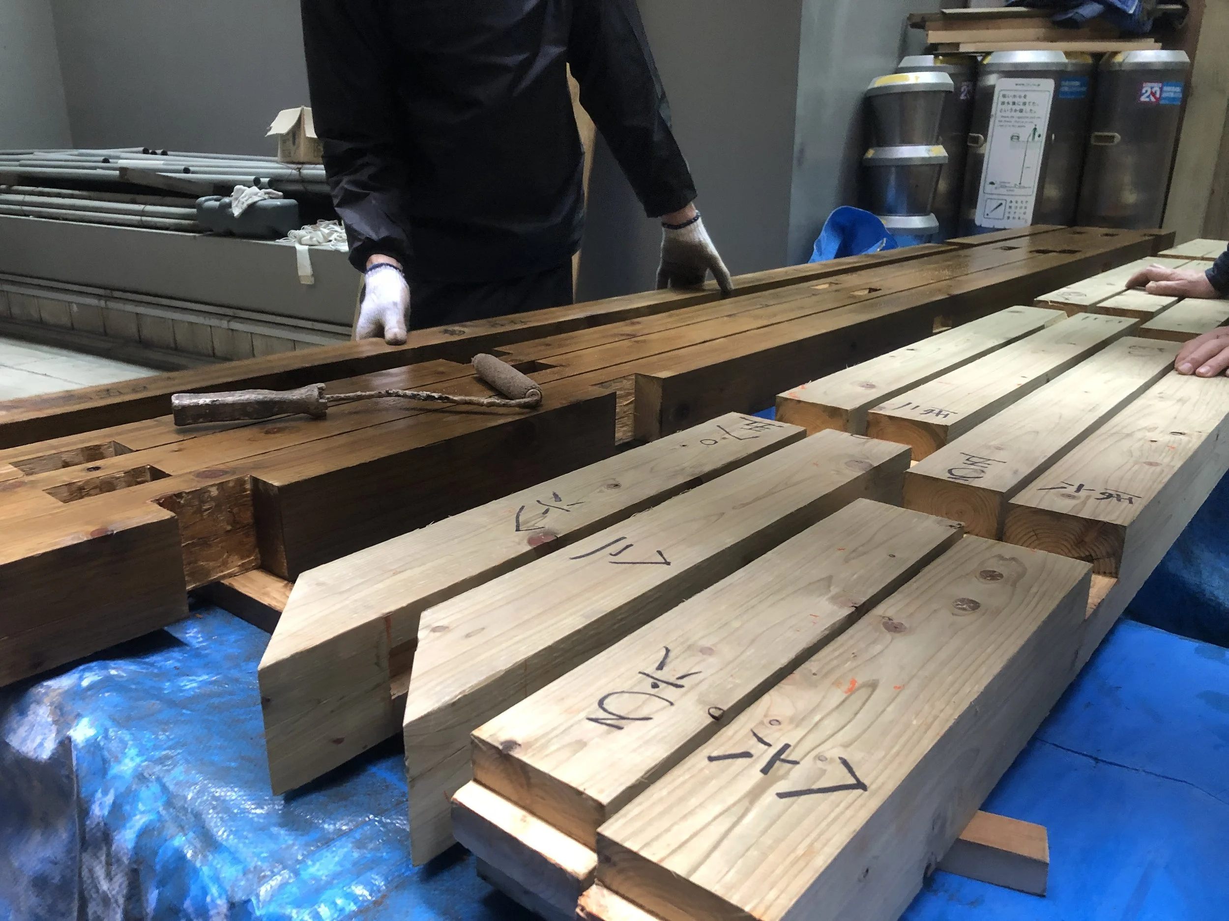 僕たちのホームエリアの大阪市港区、朝潮橋。駅前には、アイススケート場にもなる市民プール、いろいろな催し物が開かれるアリーナ、そして広大な芝生のある八幡屋公園があります。その芝生の公園の手前に木を囲んで座れる木製ベンチを作成させていただきました。ヒノキの木が自然溢れるこの場所に主張しすぎず馴染みます。